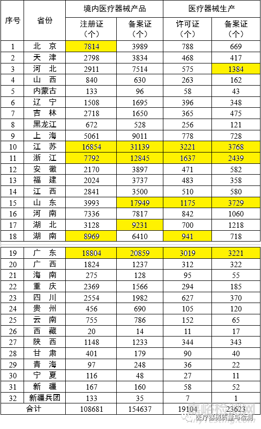 各省医疗器械注册与生产许可备案统计一览